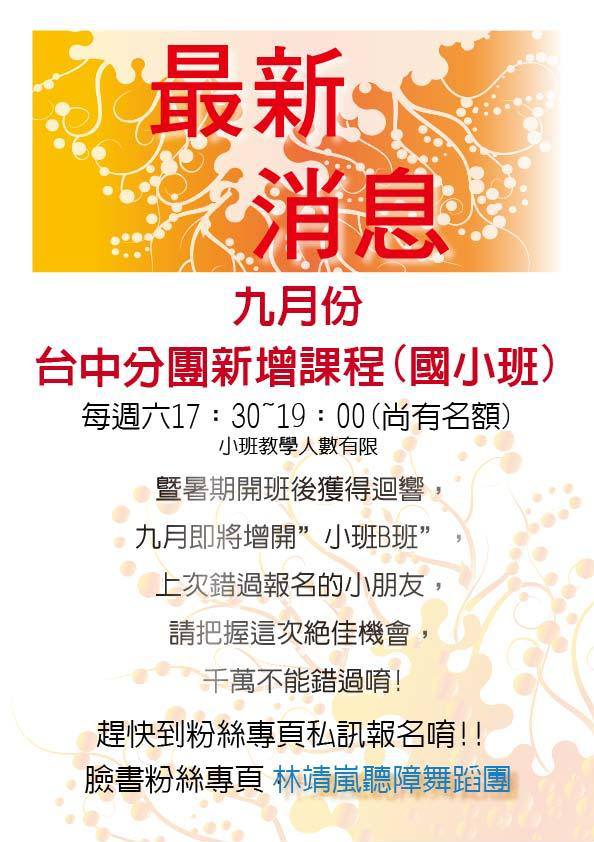暨暑期七、八月份台中國小專業班獲受好評,九月份增開台中(國小班),於每週六下午17:30~19:00,趕快將最新消息告訴您的親朋好友,千萬別錯過了,團長親自從台北南下至台中開課,機會難得,別錯失良機唷!!
